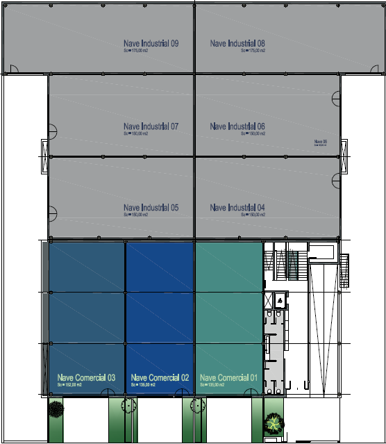 Las naves industriales y comerciales del edificio Táctica Hub se encuentran en la planta baja. Desde aquí podrás conocer mejor su disposición y los elementos adicionales que ofrece.